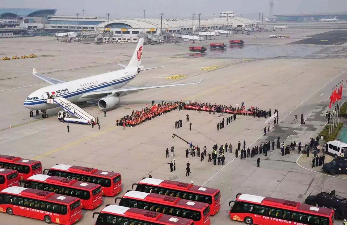 下午2點(diǎn)多,在首都機(jī)場(chǎng)停機(jī)坪,一輛輛北汽福田歐輝新能源高端商務(wù)大巴列隊(duì)排開,車頭裝飾著綢布紅花,紅色車身張貼著“熱烈歡迎北京援鄂醫(yī)療隊(duì)凱旋”的標(biāo)語,靜靜等待著即將抵達(dá)的返京醫(yī)療隊(duì)。終于,醫(yī)療隊(duì)員們乘坐的航班降落在首都機(jī)場(chǎng),機(jī)場(chǎng)以民航界最高禮遇“過水門”迎接英雄,為他們“接風(fēng)洗塵”。艙門緩緩打開,隊(duì)員們手持國旗、鮮花,依次走下舷梯。前來迎接的隊(duì)員家屬代表、醫(yī)護(hù)人員代表、機(jī)場(chǎng)工作人員或肅立注目,或揮手歡呼,以各自的方式向這些北京英雄們表達(dá)著最崇高的敬意。