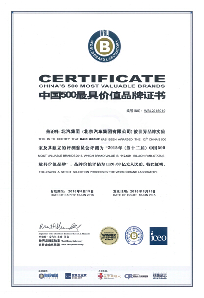 6月16 日,國(guó)際權(quán)威品牌研究機(jī)構(gòu)“世界品牌實(shí)驗(yàn)室”在京發(fā)布2015年(第十二屆)《中國(guó)500 最具價(jià)值品牌》排行榜,北汽集團(tuán)憑借1126.69 億元品牌價(jià)值位列排行榜第19 位,相較去年品牌價(jià)值(986.75 億元)增長(zhǎng)14.2% ,穩(wěn)居中國(guó)最具價(jià)值汽車企業(yè)前三強(qiáng),同時(shí)位居北京市屬企業(yè)首位。
